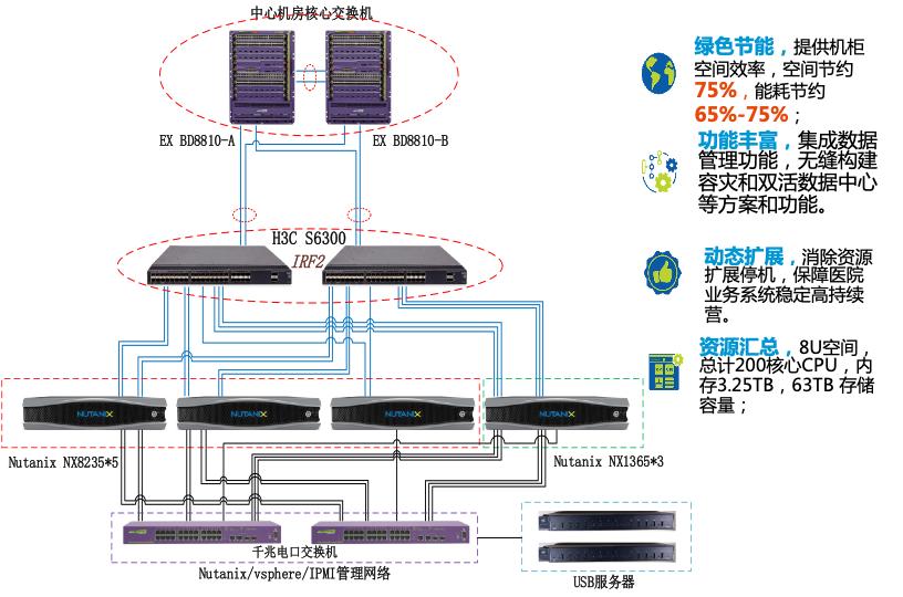 建設內容:云平臺采購8節點超融合設備組成群集,2臺高速度萬兆以太網交換機提供獨立的分布式存儲和應用系統訪問,云平臺可提供具有高可用且兼容醫院所有可運行在X86平臺的虛擬化群集。2臺USB服務器提供28個USB接口兼容加密狗、U盤等設備。