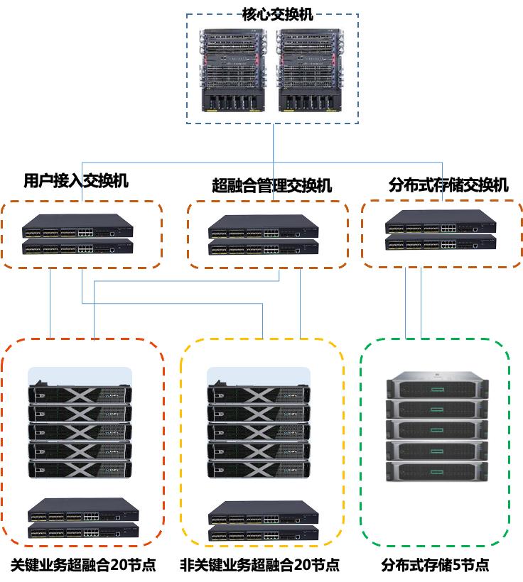 項目內容:互聯網區云平臺采用超融合設計,基于40臺2U服務器設備,以及25G高速以太網交換機構建,通過軟件定義的方式,將服務器的計算、存儲,網絡等資源池化,進而構建成一套可彈性擴展,高性能,高可靠的超融合平臺。其中,兩臺交換機冗余部署,分別連接到每臺服務器的2個冗余網卡上,用于超融合系統內部數據副本一致性同步。