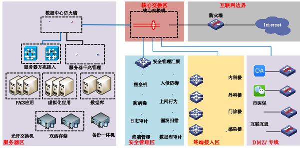 建設內容:根據醫院信息系統功能進行網絡分區,針對不同區域特點進行相應的網絡保護。具體分為服務器區、終端接入區、安全管理區、專線接入區、核心交換區和互聯網邊界區。感染樓、內科樓及門診13樓目前暫無匯聚物理安裝條件,我司使用PON網絡,在每個樓層設置一個或多個分光器,分光器與各科室ONU連接,各科室的終端設備(電腦、打印機等)接入OUN。