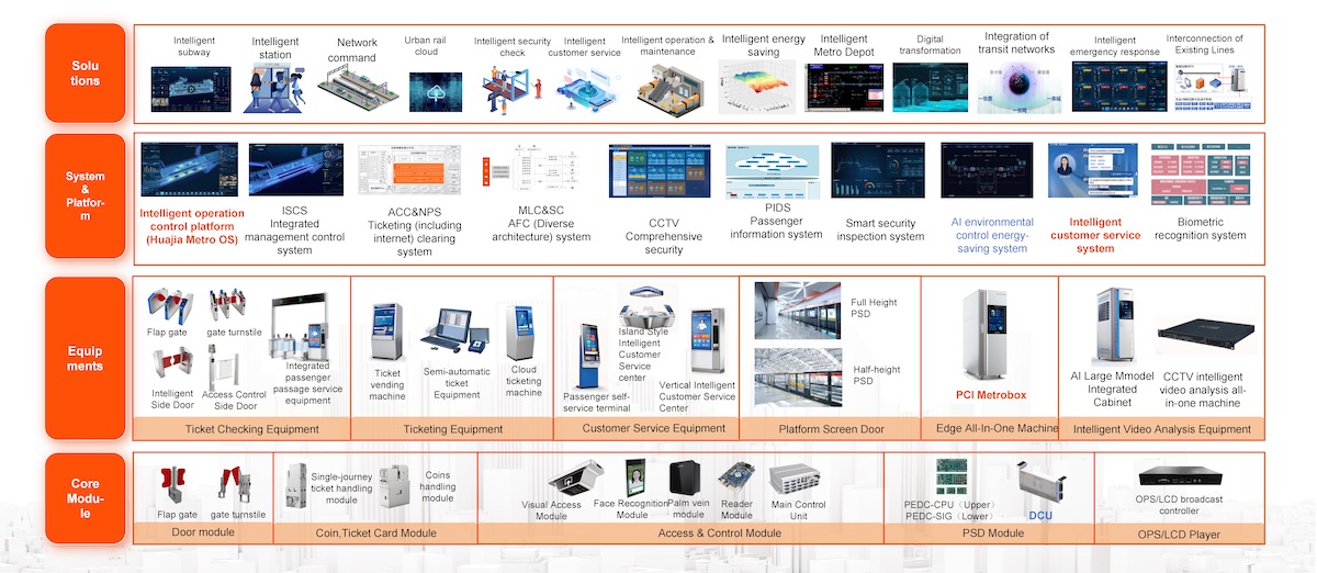 18 Modules + 60 Equipment + 22 System Products, multiple Innovative Products: Intelligent operation control platform(Huajia Metro OS)V1.5, urban rail transit edge integrated machine (PCI MetroBox), and urban rail transit intelligent customer service system V1.0 were selected in the "Recommended List of the third batch of autonomous equipment for urban rail transit".