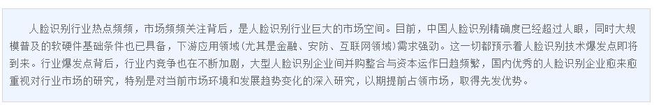 人臉識別行業(yè)熱點頻頻,市場頻頻關注背后,是人臉識別行業(yè)巨大的市場空間。目前,中國人臉識別精確度已經超過人眼,同時大規(guī)模普及的軟硬件基礎條件也已具備,下游應用領域(尤其是金融、安防、互聯(lián)網領域)需求強勁。這一切都預示著人臉識別技術爆發(fā)點即將到來。行業(yè)爆發(fā)點背后,行業(yè)內競爭也在不斷加劇,大型人臉識別企業(yè)間并購整合與資本運作日趨頻繁,國內優(yōu)秀的人臉識別企業(yè)愈來愈重視對行業(yè)市場的研究,特別是對當前市場環(huán)境和發(fā)展趨勢變化的深入研究,以期提前占領市場,取得先發(fā)優(yōu)勢。