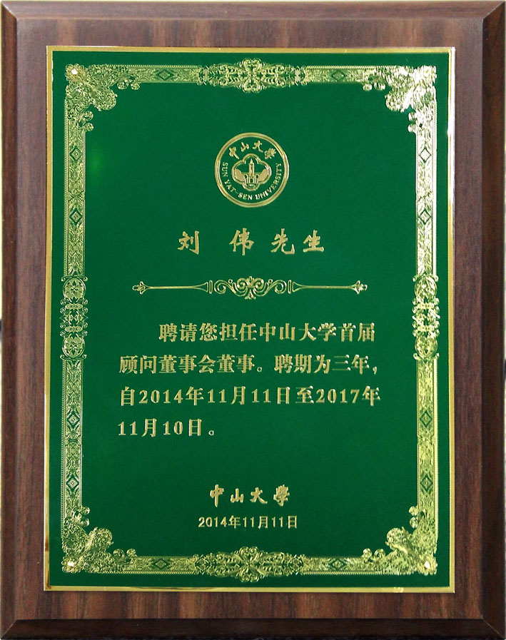 據(jù)了解,中山大學顧問董事會是由具有較高學術(shù)地位和社會聲望的各界專家、校友、社會賢達組成的高層決策咨詢、參謀機構(gòu),是學校與社會各界全面、緊密合作的橋梁和紐帶。2014年,劉偉先生被正式聘請擔任首屆顧問董事會董事,聘期三年。