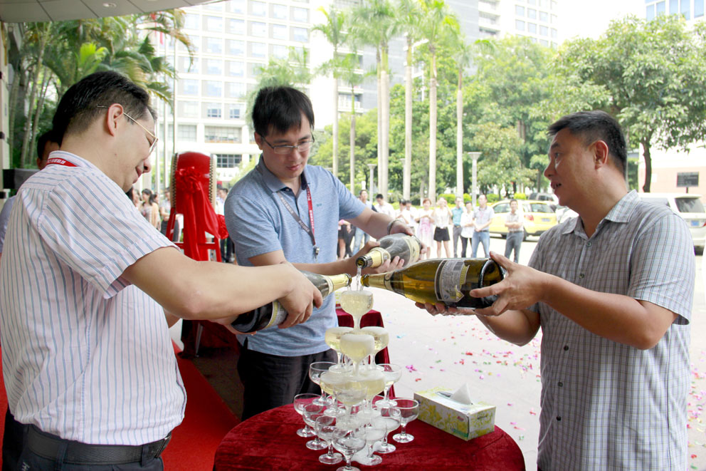 在慶功典禮上,董事長(zhǎng)劉偉,副總裁顧友良,助理總裁、智能安防(廣東)事業(yè)部總經(jīng)理劉斌共同開啟香檳慶祝