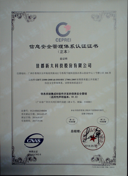 2014年3~4月,佳都科技順利通過了國際標準及權威的ISO27001信息安全認證體系和ISO20000信息技術服務管理體系,取得了廣州賽寶認證中心頒發的ISO/IEC 27001:2005信息安全管理體系認證證書和ISO/IEC 20000-1:2011信息技術服務管理體系認證證書。
